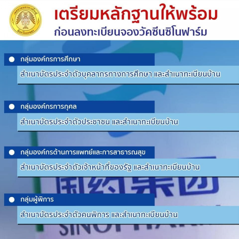 เตรียมหลักฐานให้พร้อม ก่อนลงทะเบียนจองวัคซีนซิโนฟาร์ม! วันที่ 29 กรกฎาคม 2564 เวลา 09.00 น. -
