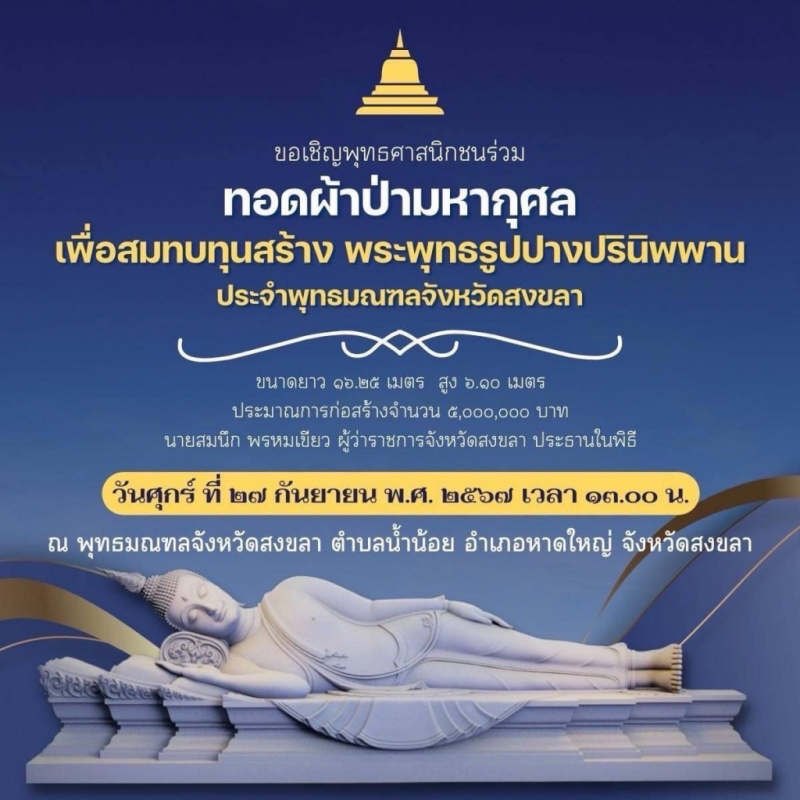 เพื่อสมทบทุนสร้าง พระพุทธรูปปางปรินิพพานประจำพุทธมณฑลจังหวัดสงขลา ขนาดยาว 16.25 เมตร สูง 6.10 เมตร
