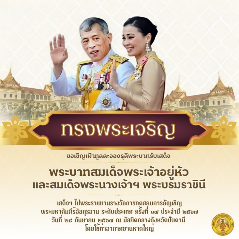 ขอเชิญทูลเฝ้าทูลละอองธุลีพระบาทรับเสด็จ พระบาทสมเด็จพระเจ้าอยู่หัว และสมเด็จพระนางเจ้าฯ พระบรมราชินี เสด็จพระราชดำเนินทรงปฏิบัติพระราชกรณียกิจในพื้นที่จังหวัดปัตตานี พระราชทานรางวัลการทดสอบการอัญเชิญพระมหาคัมภีร์อัลกุรอานระดับประเทศ ครั้งที่ 17 ประจำปี 2567 ที่ได้รับรางวัลชนะเลิศและรองชนะเลิศ ในวันที่ 28 กันยายน 2567 ณ มัสยิดกลางจังหวัดปัตตานี