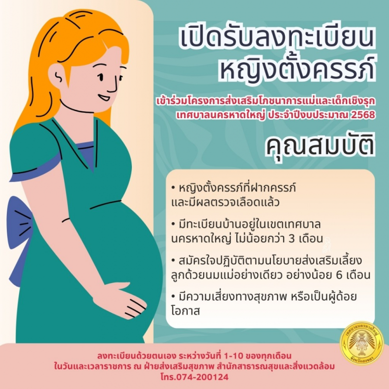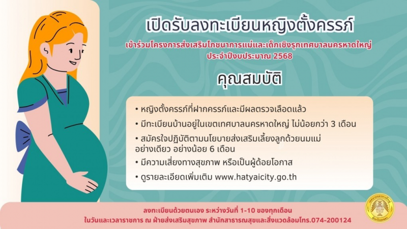 เทศบาลนครหาดใหญ่ เปิดรับลงทะเบียนผู้เข้าร่วมโครงการส่งเสริมโภชนาการแม่และเด็กเชิงรุก ประจำปีงบประมาณ พ.ศ.2568 โดยกำหนดเปิดรับลงทะเบียนทุกวันที่ 1-10 ของทุกเดือน ในวันเวลาราชการ ( เวลา 08.30-16.30 น.) ณ ฝ่ายส่งเสริมสุขภาพ สำนักการสาธารณสุขและสิ่งแวดล้อม เทศบาลนครหาดใหญ่ หมายเลขโทรศัพท์ 074-200124