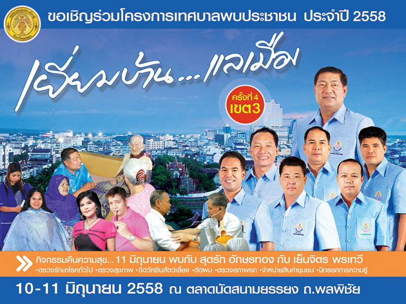 เทศบาลนครหาดใหญ่ ขอเชิญร่วมโครงการเทศบาลพบประชาชน เยี่ยมบ้าน...แลเมือง "คืนความสุขให้ชาวหาดใหญ่" ประจำปี 2558 ครั้งที่ 4 เขต 3 ระหว่างวันที่ 10 -11 มิถุนายน 2558 ตั้งแต่เวลา 16.00 น. เป็นต้นไป ณ ตลาดนัดสนามยรรยง ถนนพลพิชัย อำเภอหาดใหญ่ จังหวัดสงขลา