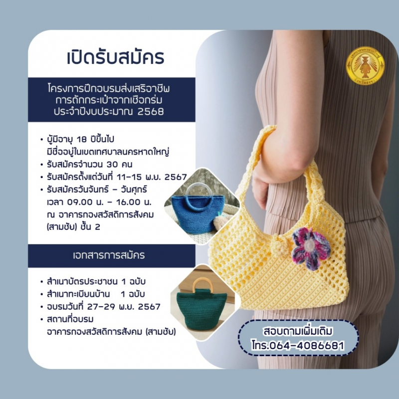 เปิดรับสมัครผู้สนใจ เข้าร่วมโครงการฝึกอบรมส่งเสริมอาชีพ การถักกระเป๋าจากเชือกร่ม ประจำปีงบประมาณ 2568