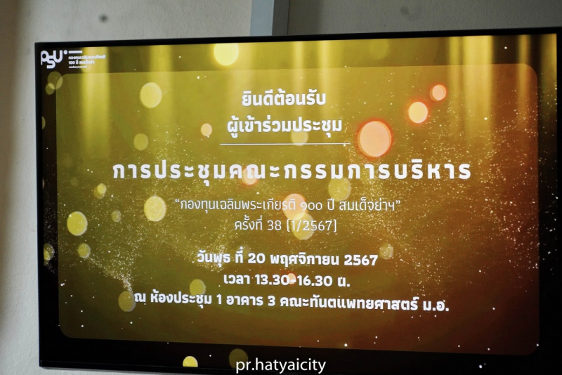 20 พฤศจิกายน 2567 เทศบาลนครหาดใหญ่ พล.ต.ท.สาคร ทองมุณี นายกเทศมนตรีนครหาดใหญ่ มอบหมาย นายสัมฤทธิ์ บุญรัตน์ รองนายกเทศมนตรีนครหาดใหญ่ พร้อมด้วย แขกผู้มีเกียรติ คณะทำงาน เจ้าหน้าที่ ทุกหน่วยงานที่เกี่ยวข้อง เข้าร่วมประชุมคณะกรรมการบริหารกองทุนเฉลิมพระเกียรติ 100 ปี สมเด็จย่า คณะทันตแพทย์ศาสตร์ มหาวิทยาลัยสงขลานครินทร์ ครั้งที่ 38 (1/2567) โดยมีนายสมพร ใช้บางยาง ประธานกรรมการบริหารกองทุนเฉลิมพระเกียรติ 100 ปี สมเด็จย่าฯเป็นประธานในที่ประชุม