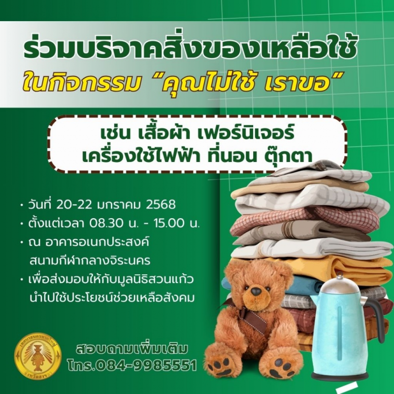 ร่วมบริจาคสิ่งของเหลือใช้ ในกิจกรรม "คุณไม่ใช้ เราขอ"