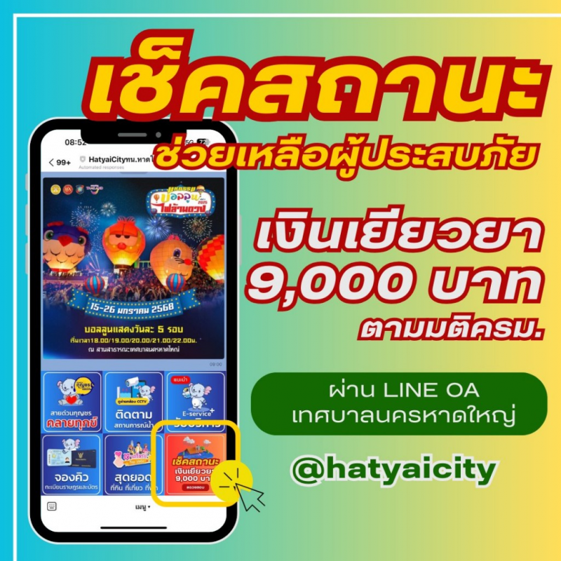 ตรวจสอบสถานะ ผู้ลงทะเบียนช่วยเหลือผู้ประสบภัยเงินเยียวยา 9,000 บาท ตามมติคณะรัฐมนตรีเมื่อวันที่ 3 ธันวาคม 2567ผ่าน LINE OA เทศบาลนครหาดใหญ่ @hatyaicity