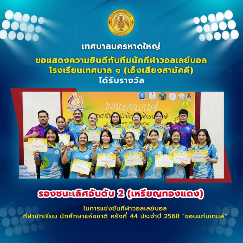 เทศบาลนครหาดใหญ่ ขอแสดงความยินดีกับทีมนักกีฬาวอลเลย์บอลโรงเรียนเทศบาล ๑ (เอ็งเสียงสามัคคี)ได้รับรางวัลรองชนะเลิศอันดับ 2 (เหรียญทองแดง)ในการแข่งขันกีฬาวอลเลย์บอลกีฬานักเรียน นักศึกษาแห่งชาติ ครั้งที่ 44 ประจำปี 2568 “ขอนแก่นเกมส์”