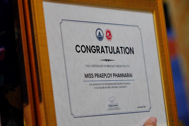 DR. RUNGDET LIU ผู้ช่วยอธิการบดีมหาวิทยาลัย อู่โจว (WHZHOU UNIVERSITY) มณฑลกว่างสี สาธารณรัฐประชาชนจีน ซึ่งเป็นตัวแทนมหาวิทยาลัย ได้มอบทุน 80 เปอร์เซ็นต์ ให้กับนักเรียนทั้งสองคน เพื่อไปเรียนต่อระดับปริญญาตรี คณะศิลปะศาสตร์ มหาวิทยาลัย อู่โจว สาธารณรัฐประชาชนจีน โดยมีคณะทำงานด้านการศึกษาของสถาบันจงซินเพื่อการศึกษาไทย จีน (ZHONGXING EDUCATION INSTITUTE) ร่วมเป็นสักขีพยาน