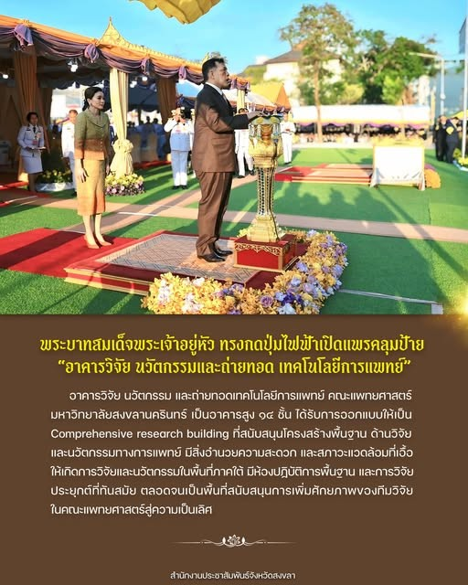 พระบาทสมเด็จพระเจ้าอยู่หัว และสมเด็จพระนางเจ้าฯ พระบรมราชินี ทรงเปิดอาคารวิจัยนวัตกรรมและถ่ายทอดเทคโนโลยีการแพทย์ ณ คณะแพทยศาสตร์ มหาวิทยาลัยสงขลานครินทร์ วิทยาเขตหาดใหญ่ จังหวัดสงขลา