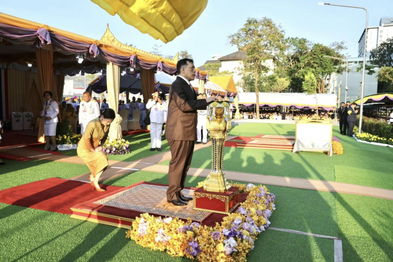 เสด็จออกจากพลับพลาพิธี ไปยังแท่นพิธีทรงกดปุ่มไฟฟ้าเปิดแพรคลุมป้าย “อาคารวิจัย นวัตกรรมและถ่ายทอด เทคโนโลยีการแพทย์” (พระสงฆ์เจริญชัยมงคลคาถา ชาวพนักงานลั่นฆ้องชัย ประโคมสังข์ แตร ดุริยางค์) เสด็จเข้าพลับพลาพิธี ทรงประเคนจตุปัจจัยไทยธรรมถวายพระสงฆ์ ประทับพระราชอาสน์ ทรงหลั่งทักษิโณทก (พระสงฆ์ถวายอนุโมทนา ถวายอดิเรก)