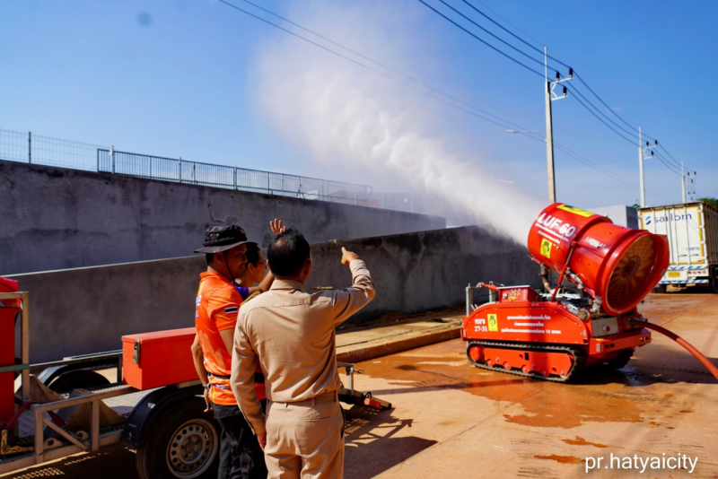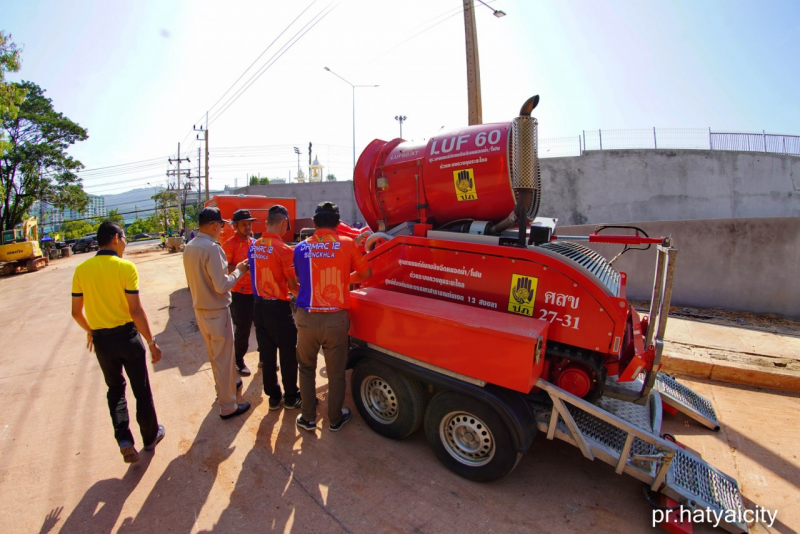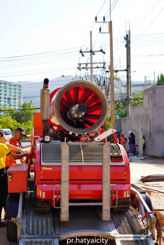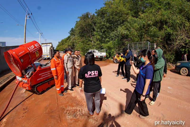 เทศบาลนครหาดใหญ่ ดำเนินการ นำรถน้ำฉีดพ่นหมอก/ละอองน้ำ บริเวณ หน้ามหาวิทยาลัยสงขลานครินทร์