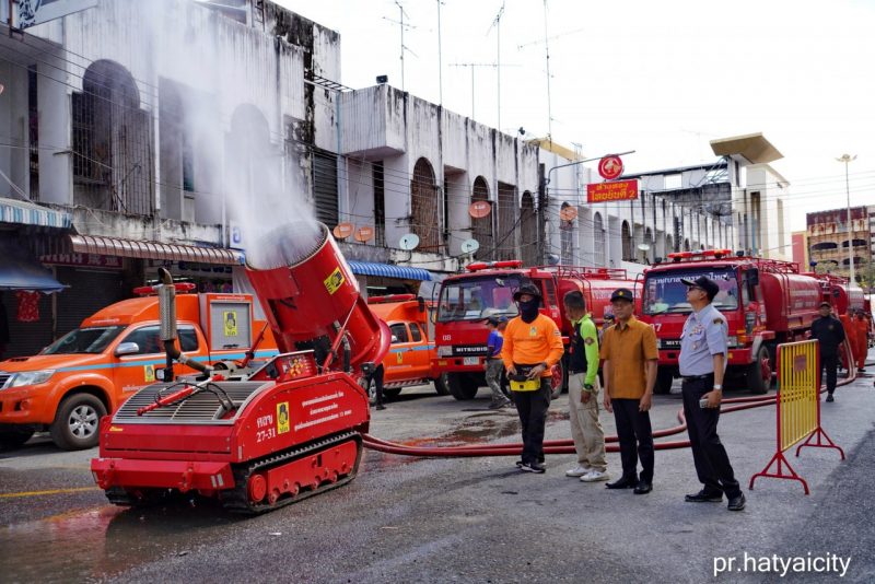 เทศบาลนครหาดใหญ่ ดำเนินการ นำรถน้ำฉีดพ่นหมอก/ละอองน้ำ บริเวณ ตลาดพลาซ่า อ.หาดใหญ่ จ.สงขลา