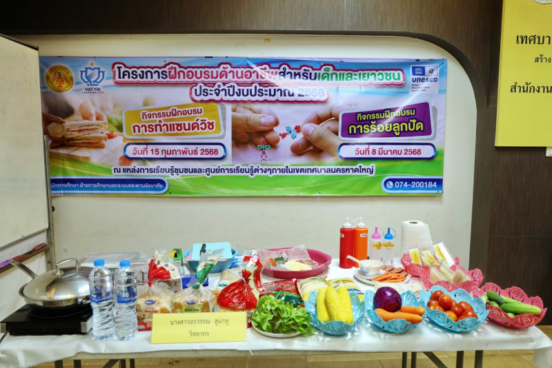 วันที่ 15 กุมภาพันธ์ 2568 ฝ่ายการศึกษานอกระบบและตามอัธยาศัย สำนักการศึกษา เทศบาลนครหาดใหญ่ ได้จัดกิจกรรมฝึกอบรมด้านอาชีพสำหรับเด็กและเยาวชน ประจำปี 2568 “การทำแซนด์วิช” ณ อุทยานการเรียนรู้นครหาดใหญ่ ในการนี้ พล.ต.ท.สาคร ทองมุณี นายกเทศมนตรีนครหาดใหญ่ มอบหมายให้ นางปิยะรัตน์ รัตนธน ผู้อำนวยการส่วนส่งเสริมการศึกษา เป็นประธานเปิดการอบรมและมอบประกาศนียบัตรแก่เด็กและเยาวชนที่เข้ารับการฝึกอบรมในครั้งนี้ด้วย